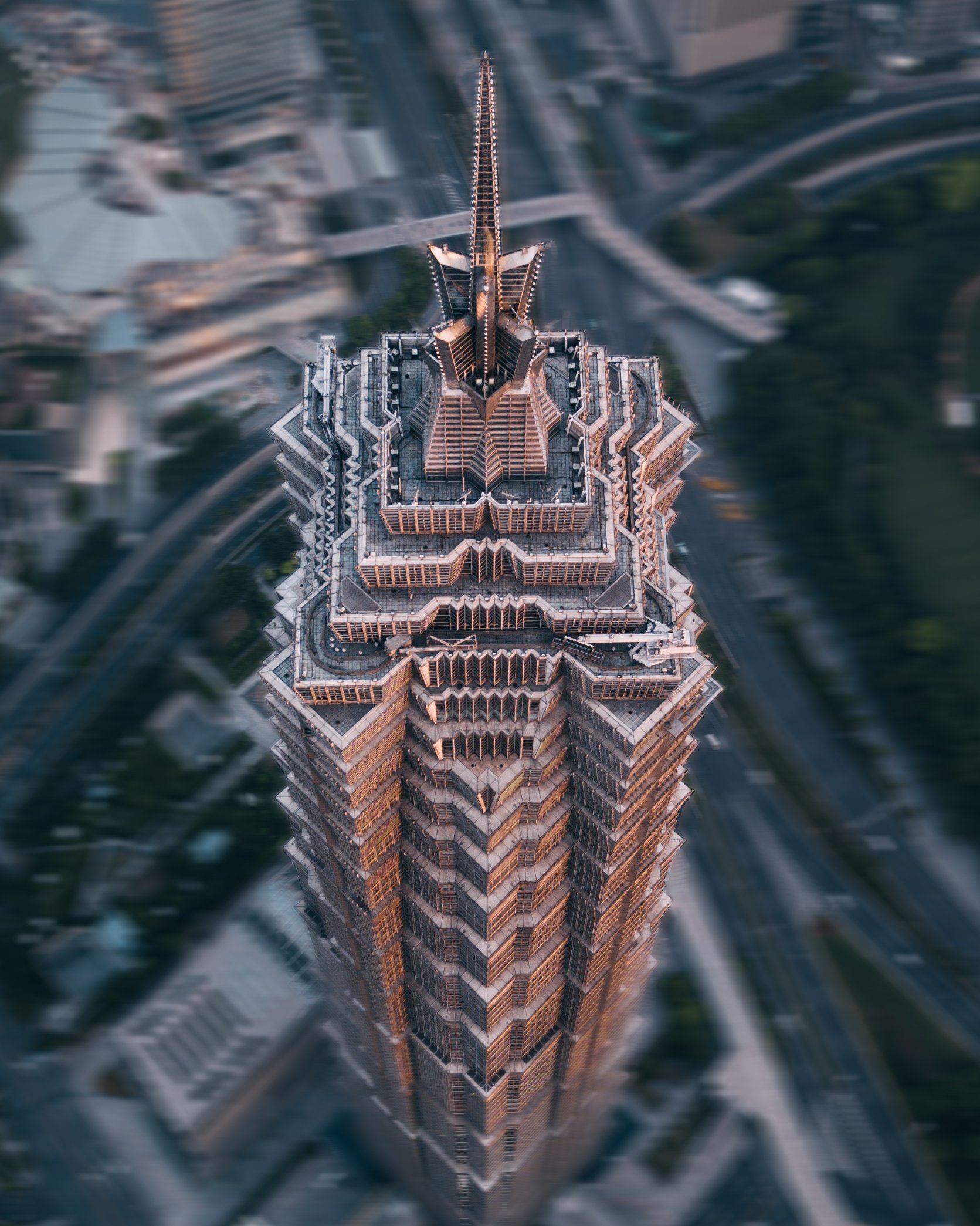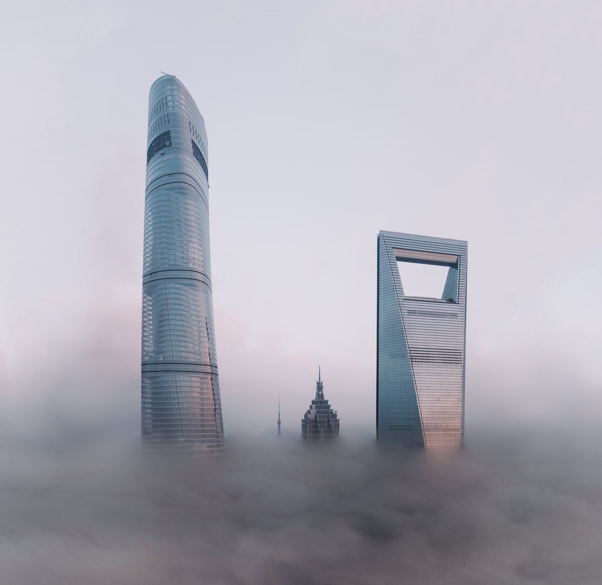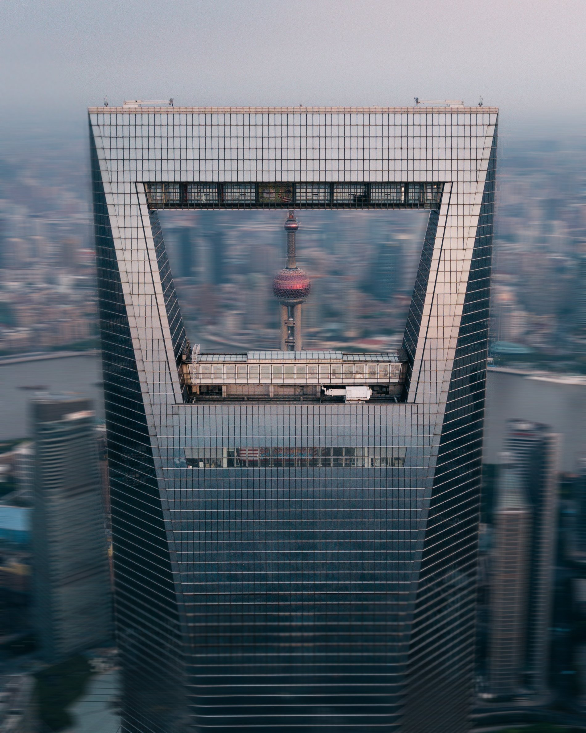 The Oriental Pearl Tower seen through the Shanghai World Financial Center